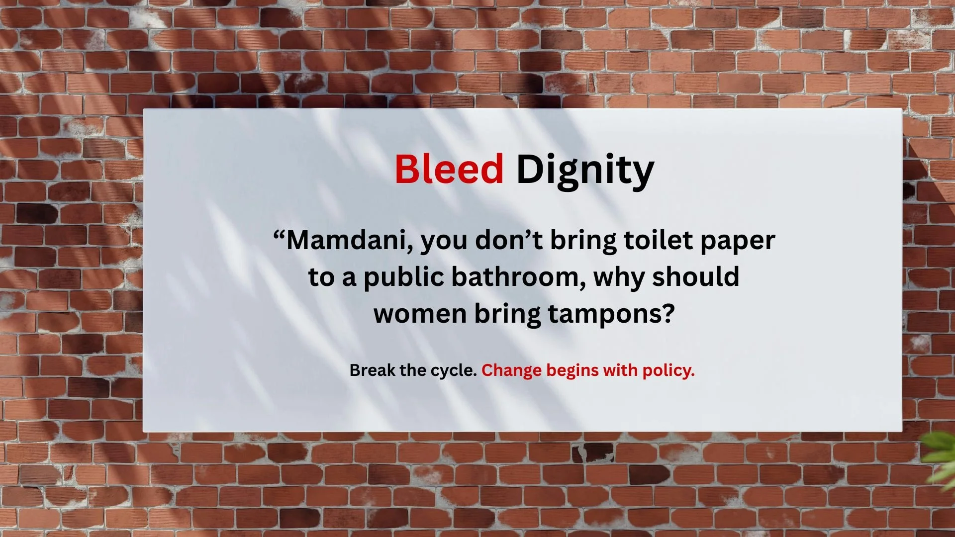We’d also address our local New York mayor, where he sits, with a pointed billboard to raise awareness of the disparity of a needed basic right.